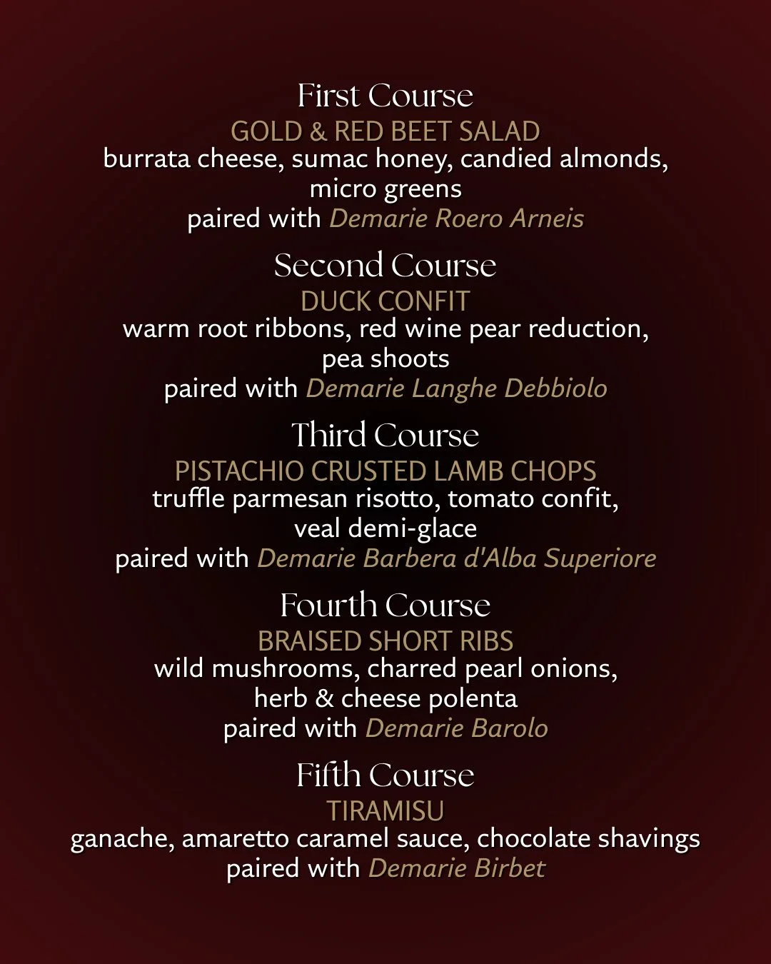 The Demarie family is three generations strong and farming 30 hectares of land in the heart of the Langhe and Roero. Based in the town of Vezza d’Alba, the family’s hard work, expertise, and passion craft classic examples of the Roero’s special terroir of sand, seashell, and limestone. Enjoy a five course paired menu that help to highlight the tradition and expertise that makes Demarie Wines so special.