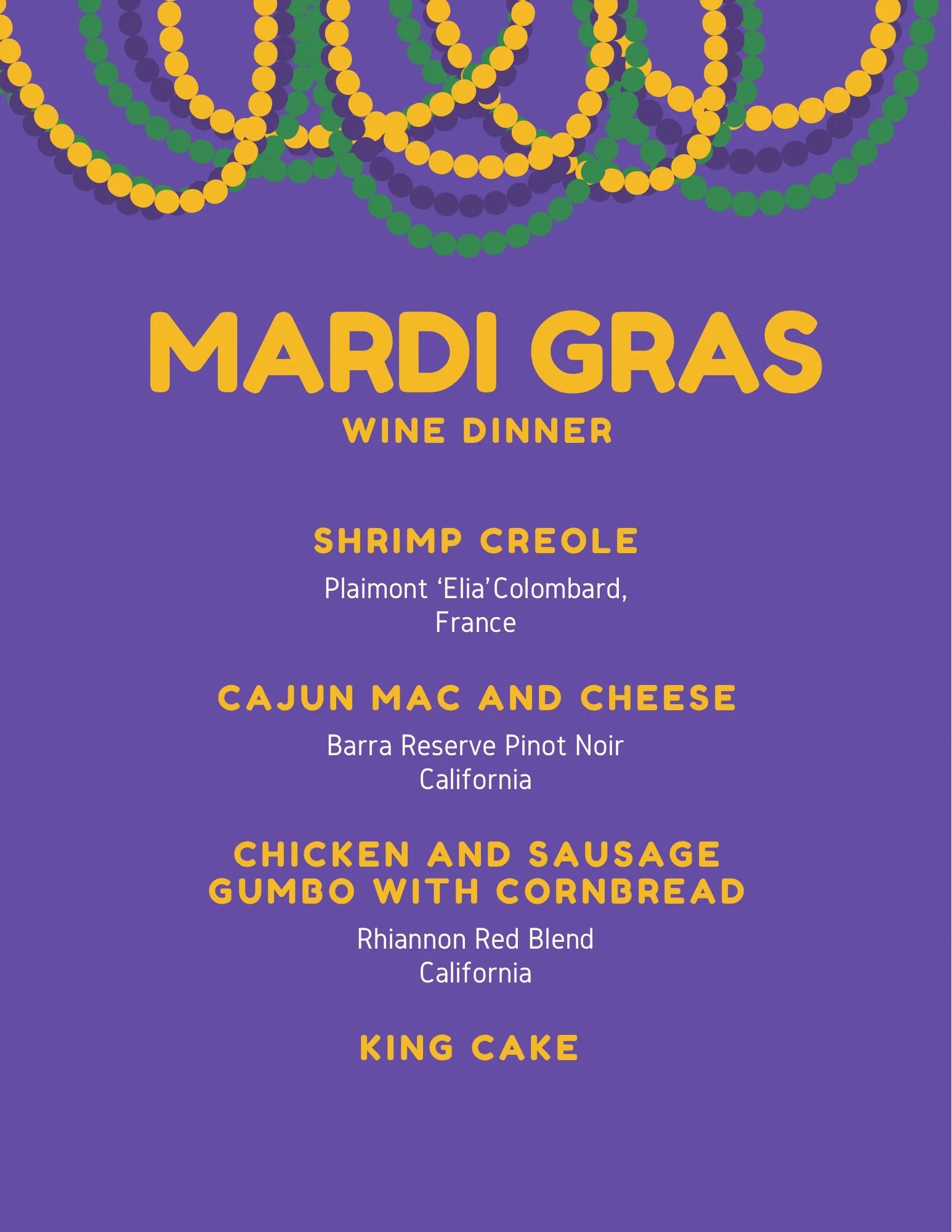 Back to All Events Mardi Gras Wine Dinner at Duet Tuesday, February 17, 2026 6:30 PM 9:00 PM Duet 108 North Detroit Avenue Tulsa, OK, 74103 United States (map) Google Calendar ICS Can’t make it to NOLA this year?Join us on Tuesday, February 17th for our Mardi Gras wine dinner! Dinner begins at 6:30pm and consists of four courses paired with three wines. Cost is $50 a person and reservations are available by calling us at 918-398-7201.