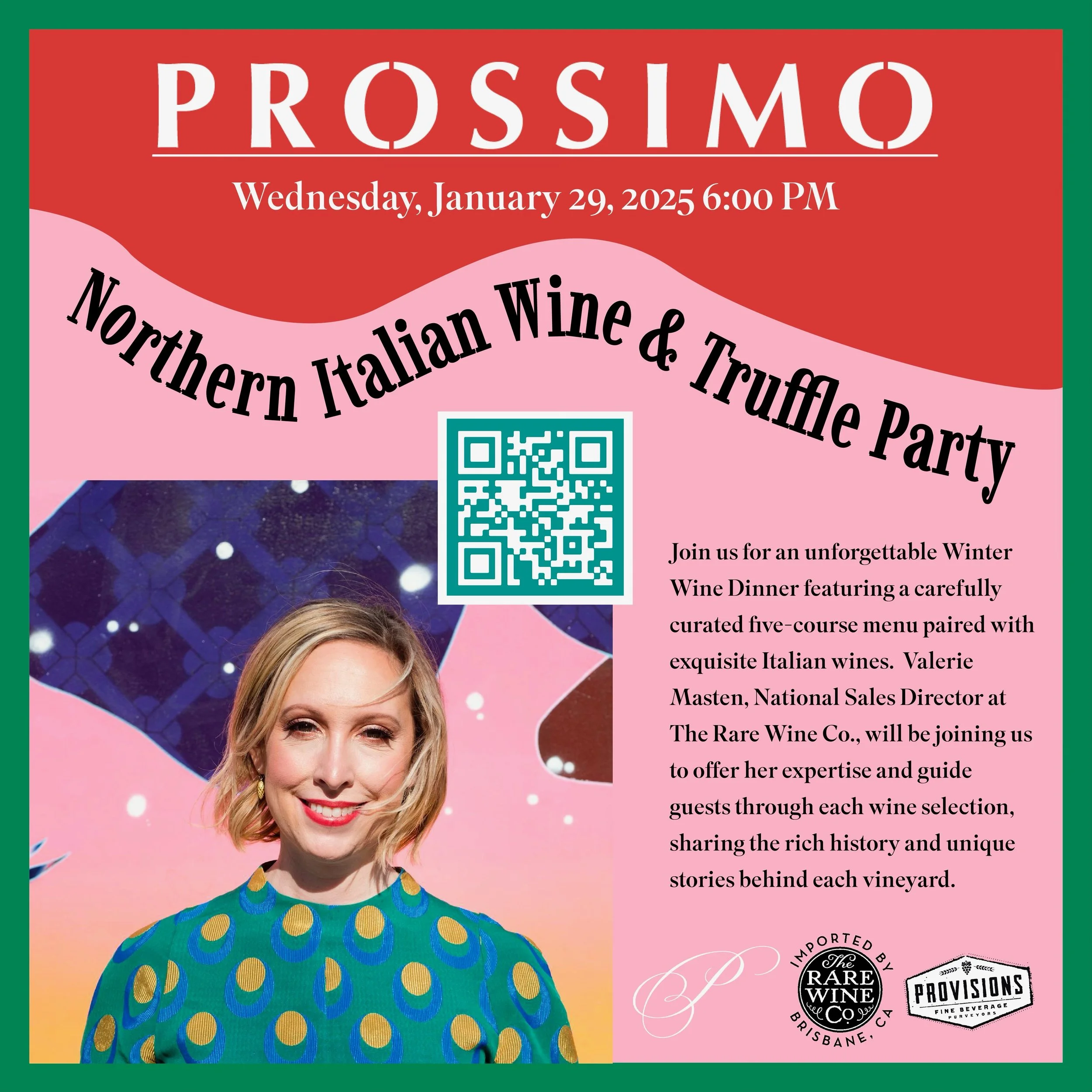 Join us for an unforgettable Winter Wine Dinner, featuring a carefully curated five-course menu paired with exquisite italian wines. Special guest Valerie Masten with Rare Wine Co. will be joining us to offer her expertise and guide guests through each wine selection, sharing the rich history and unique stories behind each vineyard. This evening promises to be a perfect blend of culinary artistry and oenological insight.