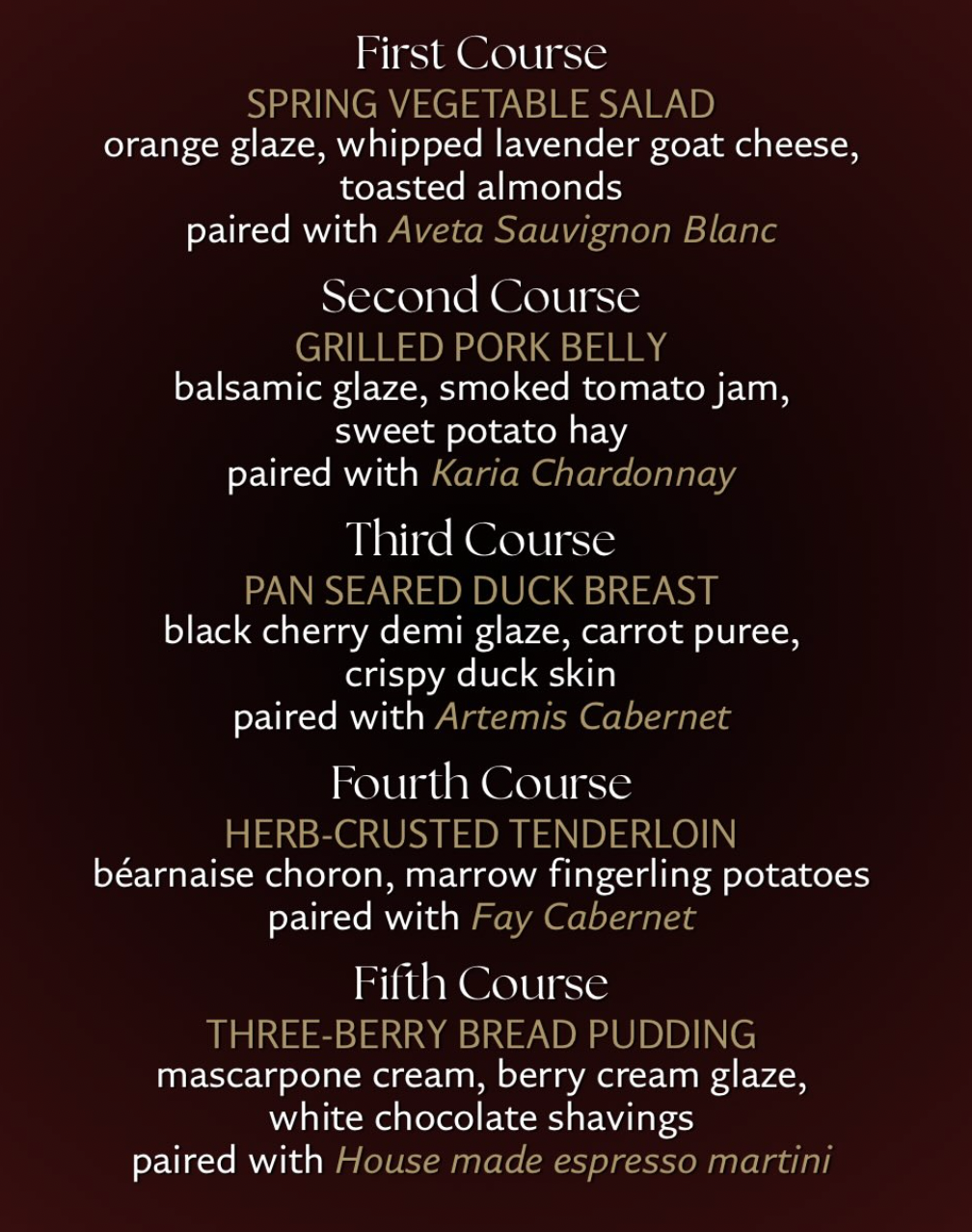 Join us for an exclusive wine dinner with Stag’s Leap Wine Cellars and try their limited run wines from a family owned vineyard. We will have their very limited Fay Cabernet paired with your fourth course. This five course chef prepared meal with carefully prepared wine tastings and is sure to please, book your tickets before they sell out!